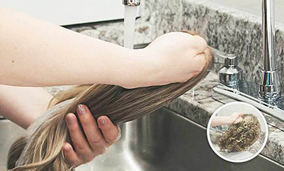 Laisser couler l'eau tiède dans le même sens que les cheveux pour éviter les emmêlements. Pressez et appuyez sur les cheveux; ne pas tordre.